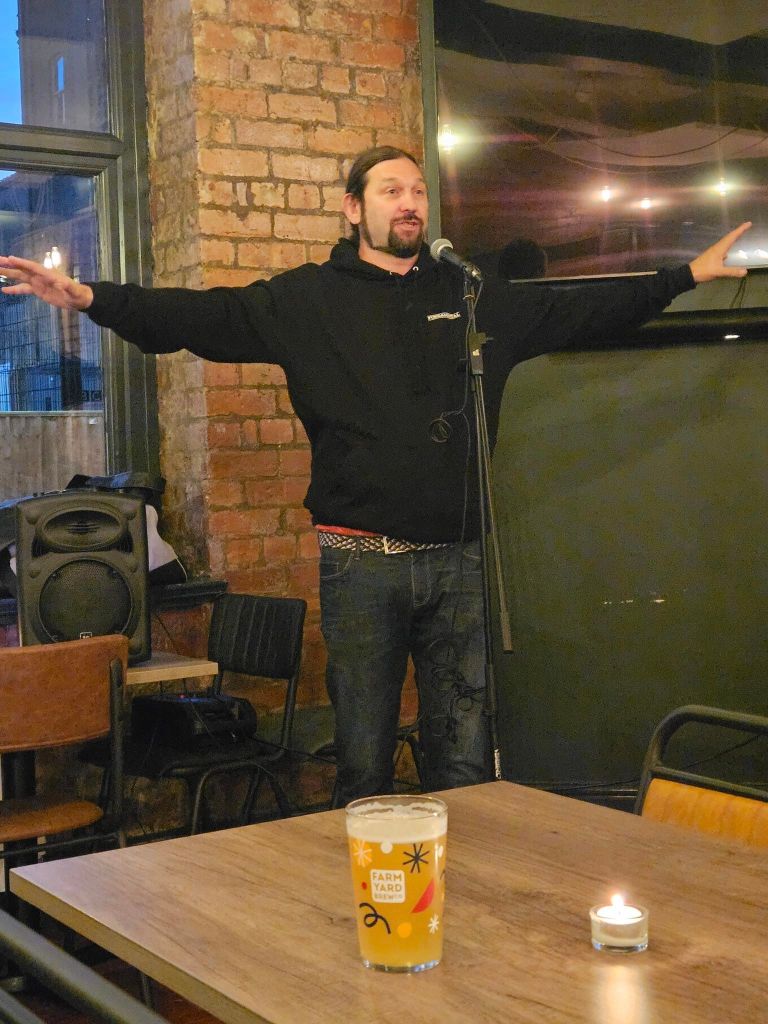 Stumble walk on the Thursday – Matt asked me to kick off the festival with some beer poems. I did sneak in two poems that mention beer but are also from my new 90s indie fan book. It was a delight to share a stage with my good mate, Barry Fentiman Hall (who I have tried and failed to meet up with for several reasons over the last year) and to hear him weave his looping magic in words about pubs, characters and place. Also from other festival regulars, Arthur with stories behind beer signs & song & story from the ever cheerful Barney Hallmann.
