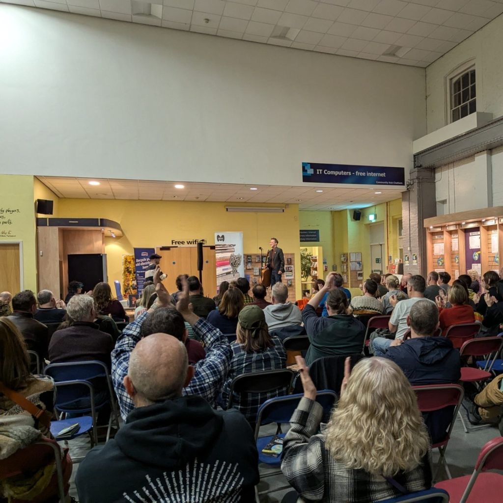 I turned up at the venue half an hour before the event was due to happen and saw chairs in rows into the distance. I dropped my case of books off and left for a nerve-settling pint and bowl of chips in The Command House next door. Returning and event ready, Marc, Jim and Mrs Jim Bob arrive soon after me and greet me cheerfully. The audience are queueing around the corner and we all sell a few books ahead of the event start time.