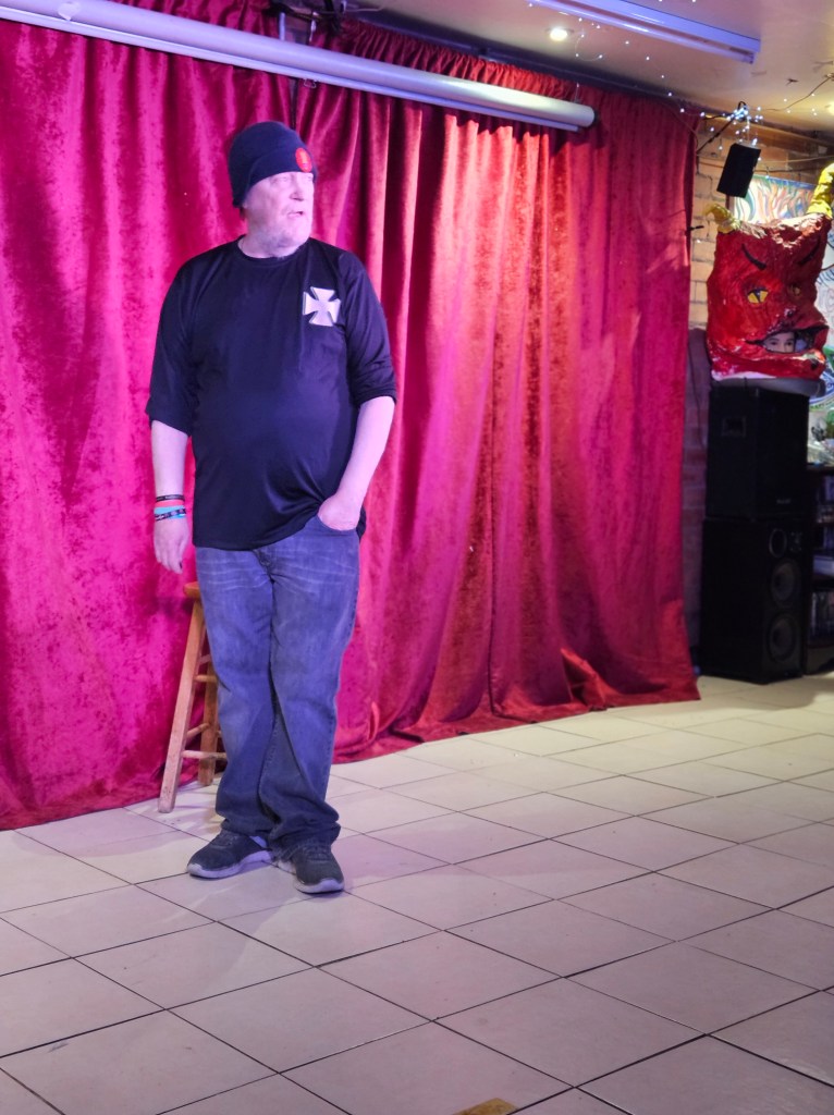 Just before I was about to take to the stage another performer, Denzil, offered me his Bluetooth speaker for music clips in the show and one bit of speech from a musician. I had never used a Bluetooth speaker and didn’t realise it wouldn’t kick-start the walk-on music from the next room so I walked on and then my walk-on music started… the show went well. People were receptive, the stage lights were new to me and a little disconcerting and I lost my way in one poem but focused and found my way back without resorting to the book, the props worked well and I may add another couple.