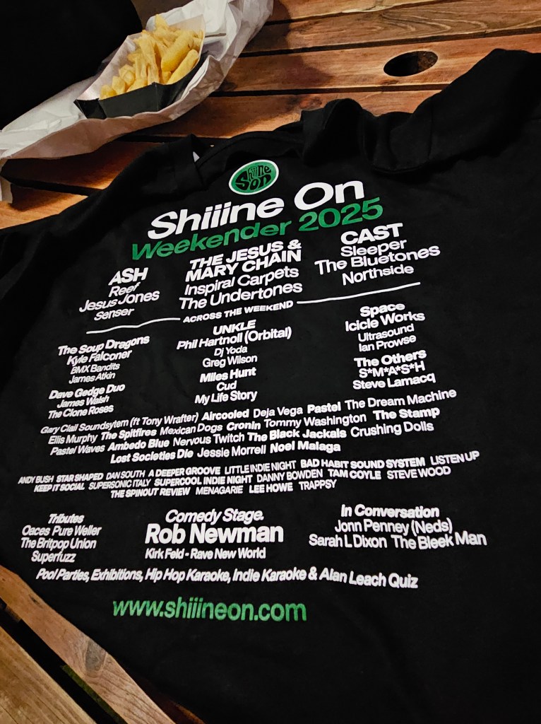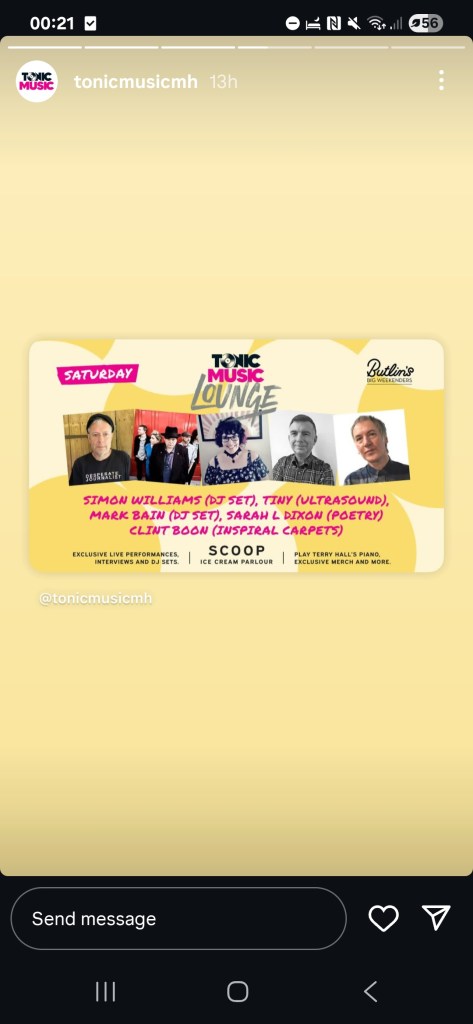 I found a t-shirt with the line-up, including me on it. The whole weekend every time something was brilliant I felt pressure to live up to being on the line-up. A friend on Whatsapp shared a photo of me up on the screen in Centre Stage – on a Tonic Mental Health poster for my chat with Simon Williams from Fierce Panda Records. I had not seen this yet! How strange and wonderful that was!
