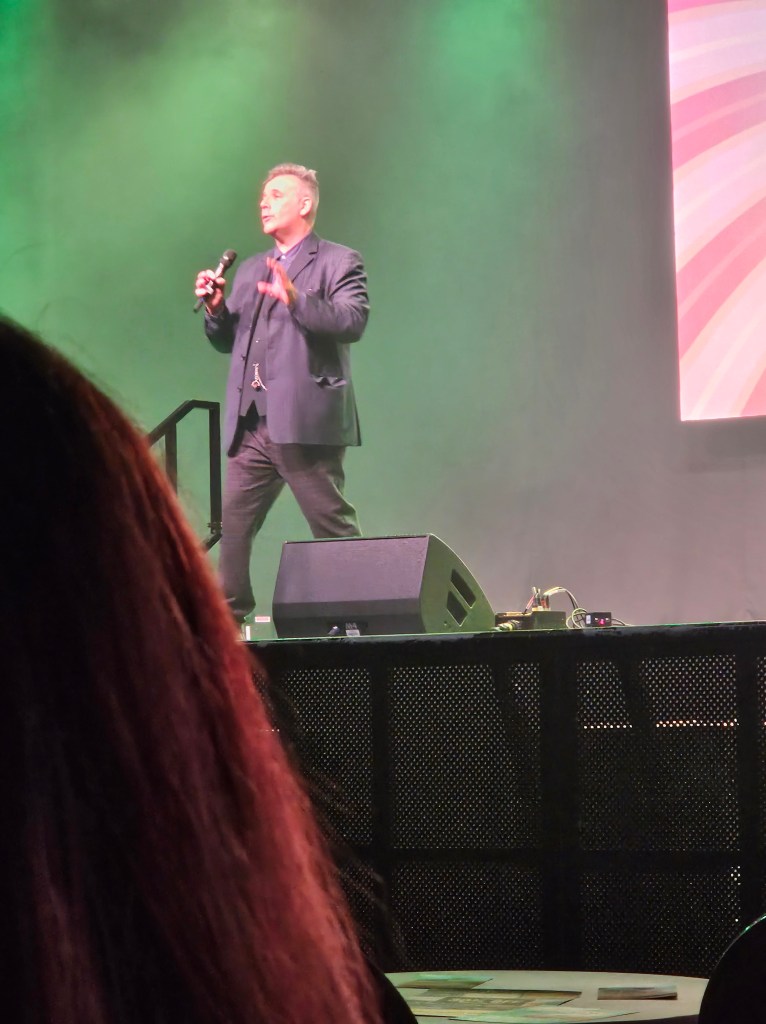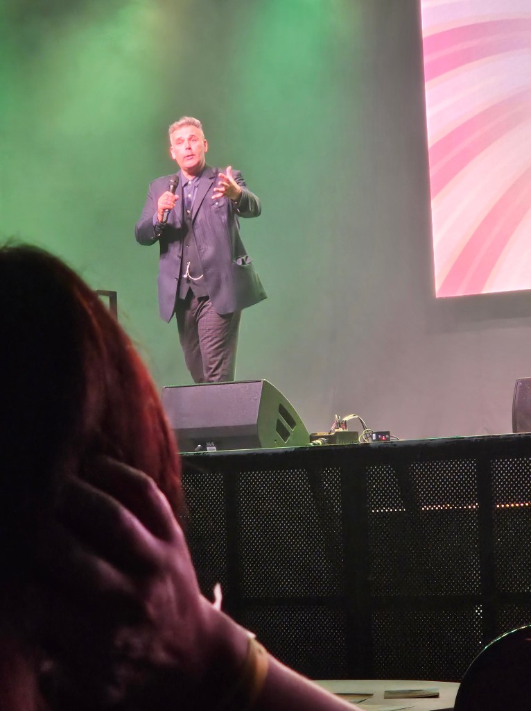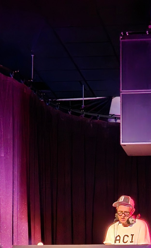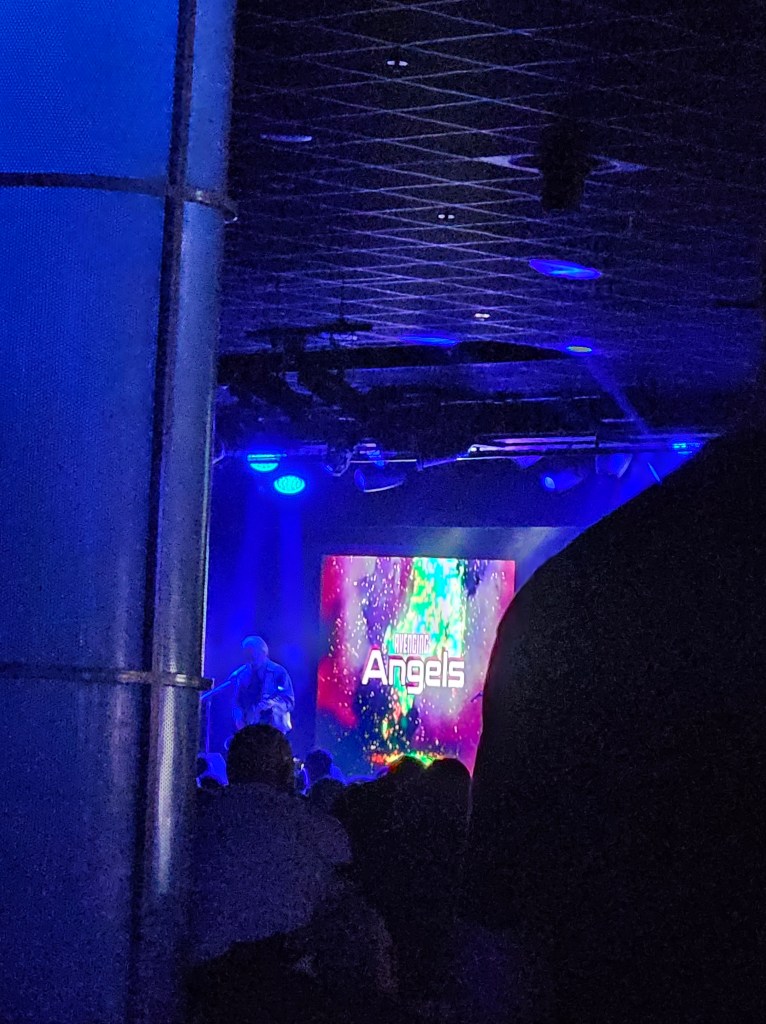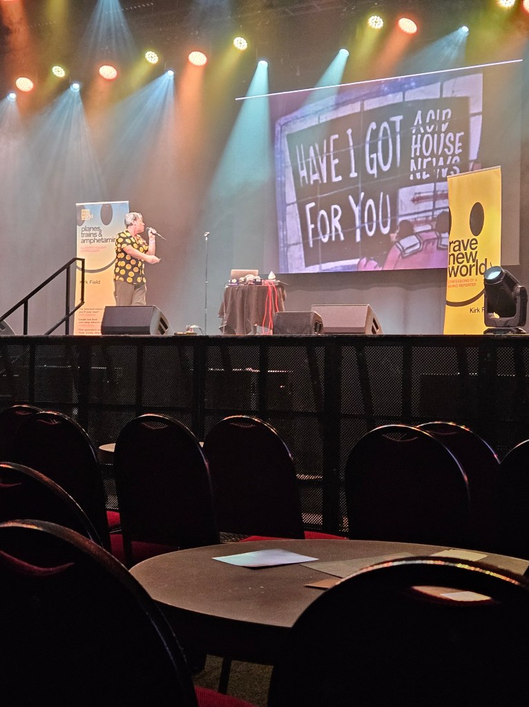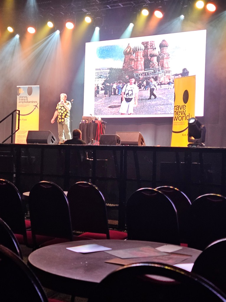 They asked me about tech requirements and I asked if they could play the Jim Bob voice tracks (apparently the way we shared this was a little quiet so I need to look into that). I had a headset rather than a mic with wire but the tech person did not explain I could wear it under my clothes. I did ask how I wore it and he said however you like so I put the beige mic belt on over my black and white Jim t-shirt – I am a little annoyed about that but am saying it was a bold fashion choice. They probably didn’t realise how new I was to venues and audiences of this size and I wasn’t about to tell them.
