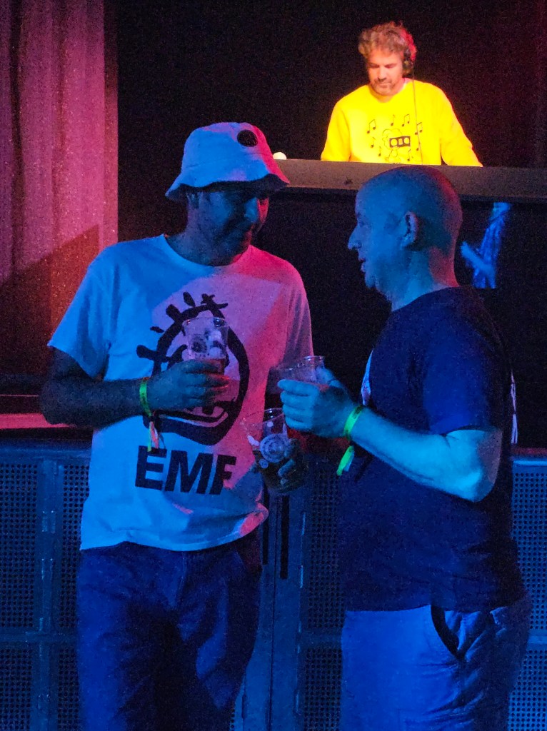 Danny and I had chatted after he played Gigantic in Bristol in May this year and I had some photos of him and Bez. Danny’s set was varied and assured but the thing I loved about it most was the contrast between his yellow top with two men in white in front of the decks. Also, capturing him and James between sets.