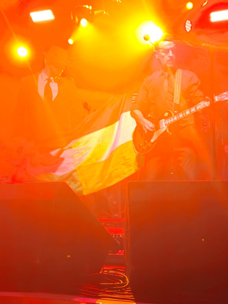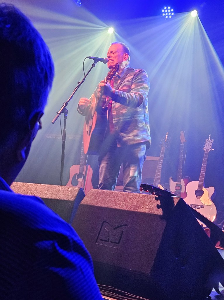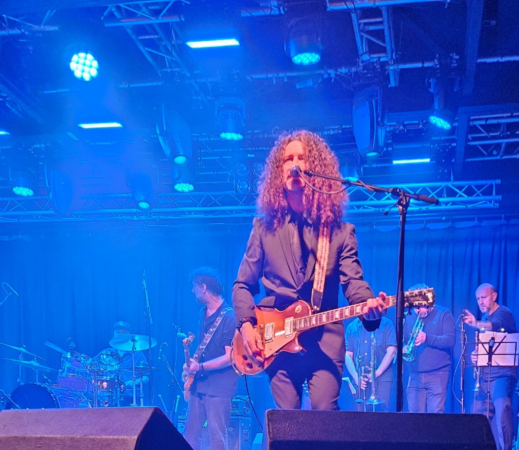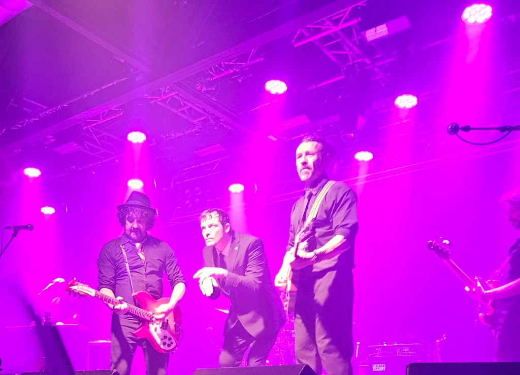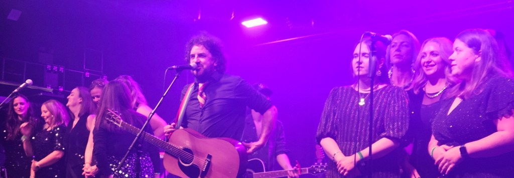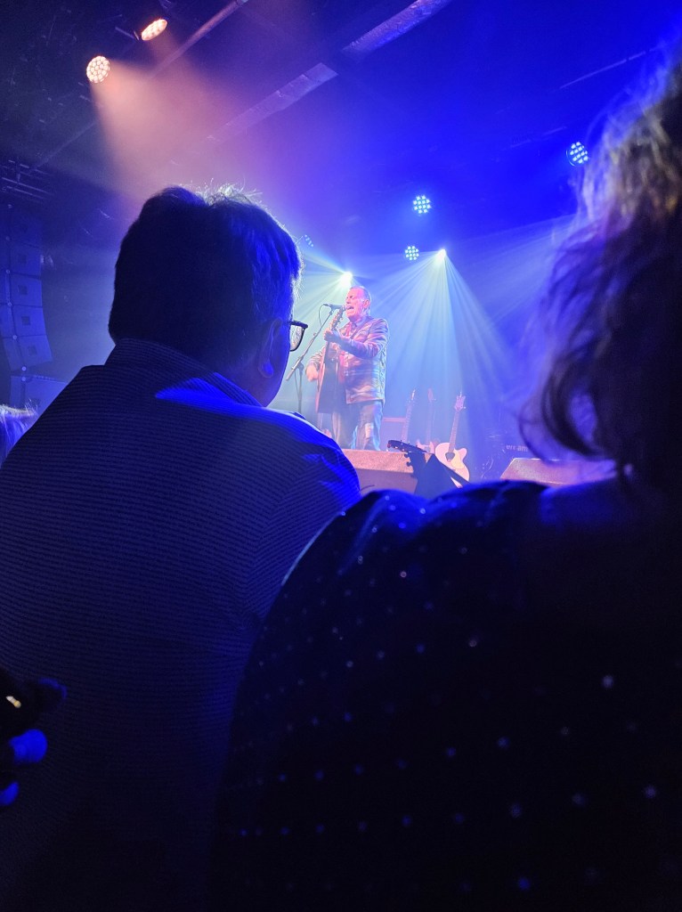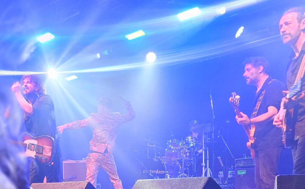 In February 2024 I made some friends at the Ian Prowse and Fiddle of Fire gig at The Parish in Huddersfield, my local venue. They told me I should go to the Christmas Knees-Up and this was not to be missed. I booked accommodation and tickets the next day. When the event came around I went along and as I only really knew Ian and Barry Jones (from Monday Club and merch desks) and I had a bit of a cold I hung back about 20 rows. I still had a brilliant time and enjoyed Amsterdam, The Blow Monkeys and the surprises – in 2024 an appearance by one of Frankie Goes to Hollywood to sing with Ian and confetti canons.