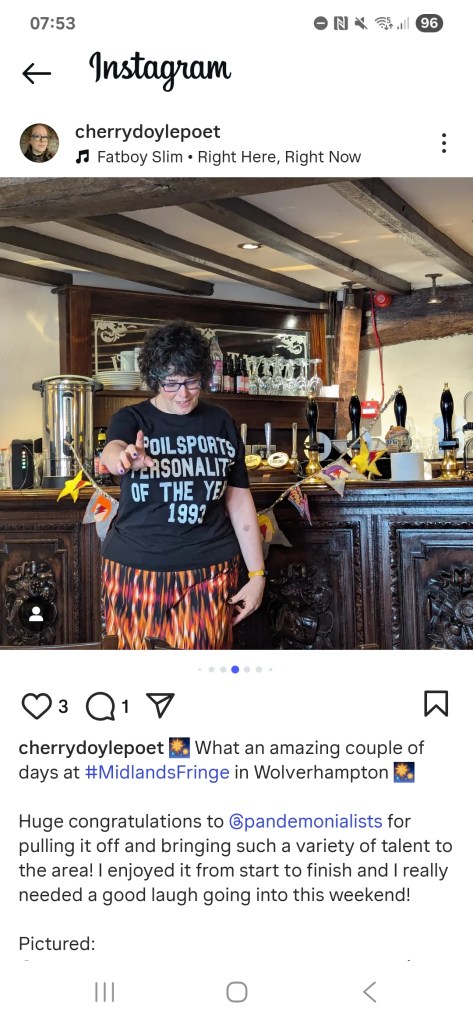 First gig of the final day of the Midland Fringe. This was one of my favourite things (like the song), vulnerable, authentic and beautiful were some of the words in my notes on Sarah’s performance which instantly connected me to my memories of music. Playing in a band saved my life in the 80s, and it’s lovely to see such honesty in a performance, ty. Venue: Lych Gate Tavern